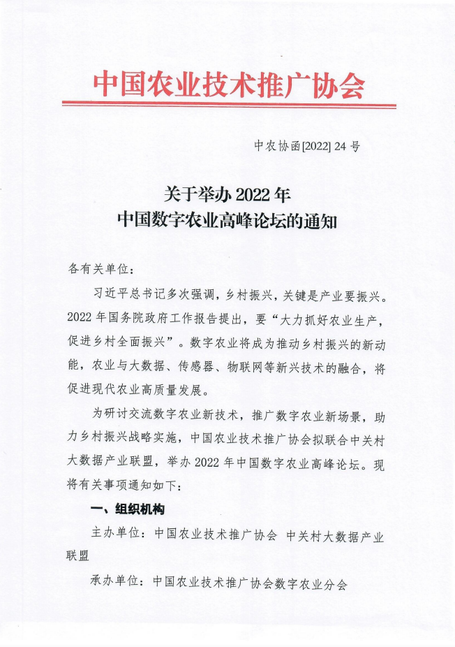 為研討交流數字農業新技術,推廣數字農業新場景,助力鄉村振興戰略實施,中國農業技術推廣協會擬聯合中關村大數據產業聯盟將于9月16日在北京亮馬河飯店舉辦2022年中國數字農業高峰論壇。
