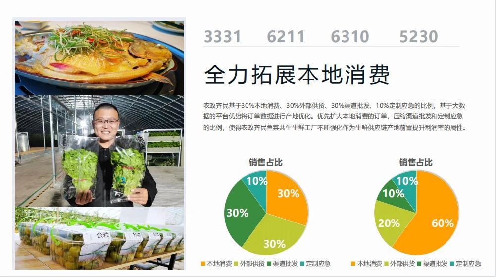 高上還分享到:農政齊民正在全力拓展本地消費。截至目前,農政齊民基于30%本地消費、30%外部供貨、30%渠道批發、10%定制應急的比例,基于大數據的平臺優勢將訂單數據進行產地優化。優先擴大本地消費的訂單,壓縮渠道批發和定制應急的比例,使得農政齊民魚菜共生生鮮工廠不斷強化作為生鮮供應鏈產地前置提升利潤率的屬性。