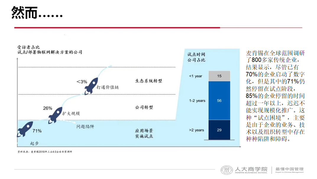 在麥肯錫的全球調研中發現,800家企業中,70%以上的企業啟動數字化轉型,但是其中的71%仍然停留在試點階段,都在做0到1的探索。
