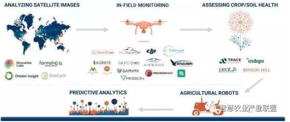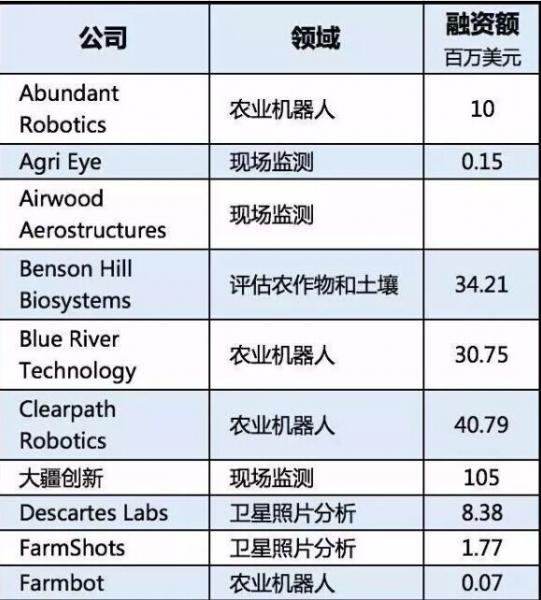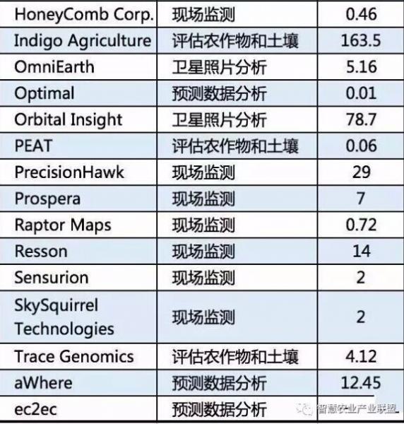 聰明的投資機(jī)構(gòu),例如Bessemer Venture Partners、Accel Partners、Khosla Ventures、Lux Capital和Data Collective,投資了許多專注農(nóng)業(yè)場(chǎng)景的通用無(wú)人機(jī)和計(jì)算機(jī)視覺(jué)公司,例如大疆和Orbital Insight,以及農(nóng)業(yè)科技創(chuàng)業(yè)公司,例如Blue River Technology。大企業(yè),包括孟山都和先正達(dá),也是活躍的農(nóng)業(yè)科技投資者,投資了Resson和Blue River Technology等公司。