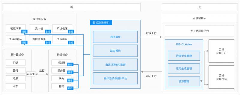 智能邊緣BIE是百度云發布的國內首個邊緣計算產品,發布伊始即推行“端云一體”解決方案,它由智能邊緣本地運行包、智能邊緣云端管理套件組成;在云端進行智能邊緣核心設備的建立、身份制定、策略規則制定、函數編寫、AI建模,然后生成配置文件下發至本地運行包,在近設備端的本地運行包里完成數據采集、消息分發、函數計算和AI推斷等功能,通過一鍵發布和無感部署的方式,極大提高智能迭代的速度,使之整體達到“訓練、管理、配置在云端,采集、轉發、計算、推斷在本地”的效果。