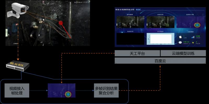 礦產安全一直是行業關注重點,國家規定在受水害威脅的地區,必須堅持“有疑必探,先探后掘”的原則。在采礦之前,探放水工作是保證安全的一道重要防線,探放水工作的完成質量直接影響后續作業的安全。百度智能邊緣和精英科技一起,將BIE-AI-BOX(包含智能邊緣BIE運行包和鉆機檢測、追蹤模型)部署在鉆探機上,將攝像頭采集到的礦井圖像幀上傳至BIE-AI-BOX,利用智能邊緣BIE加載鉆機檢測、追蹤模型對鉆機的探訪水動作(行程、速度、角度和次數)進行檢測、追蹤,實時掌控探放水工作質量,為礦產安全保駕護航。