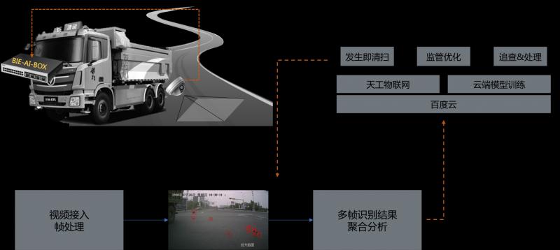 提高城市環衛工作效率的一個重要手段是控制污染源,百度智能邊緣聯合蘇州環境云,將BIE-AI-BOX(內置智能邊緣BIE運行包和渣土識別檢測模型)安裝在渣土車上,通過攝像頭實時采集渣土車經過的路面圖像幀,并將之上傳至BIE-AI-BOX,利用智能邊緣BIE加載渣土識別檢測模型對渣土拋灑污染情況進行識別、判斷,并將推斷結果上報環衛部門、交管局,使之整體達到即時發現問題,即時處理的目的。