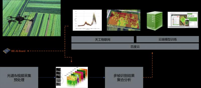 百度智能邊緣和麥飛科技一起,將BIE-AI-Board(內置檢測模型和作業模型)部署在無人機上,利用紅外攝像頭采集作物光譜信息數據,將之上傳至BIE-AI-Board,由BIE-AI-Board加載檢測模型對作物病蟲害位置、等級進行判斷,并根據檢測結果調用作業模型控制植保機執行植保作業,現該方案已在國內多塊農田里開始實施。