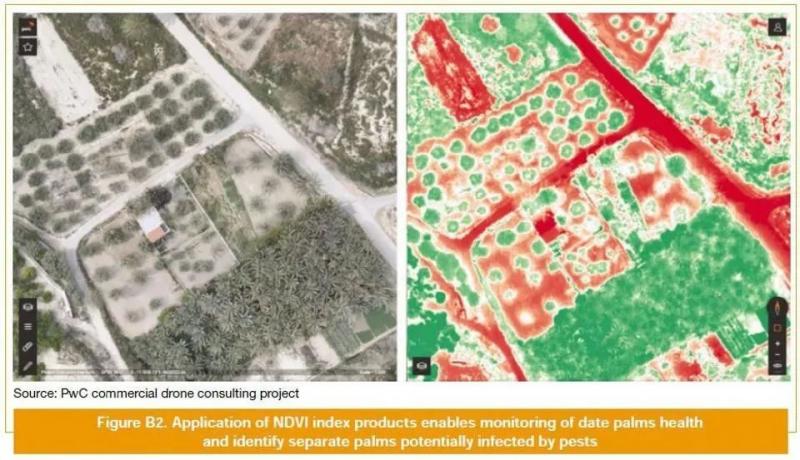 通過將無人機的紅外熱像儀數據與能夠監測植物相對健康水平的傳感器結合使用,農業管理團隊可以在AI的幫助下搶在蟲害發生之前做出預測及識別。目前,聯合國就與普華永道合作評估亞洲各棕櫚種植園中潛在的有害生物侵染問題,如下圖所示: