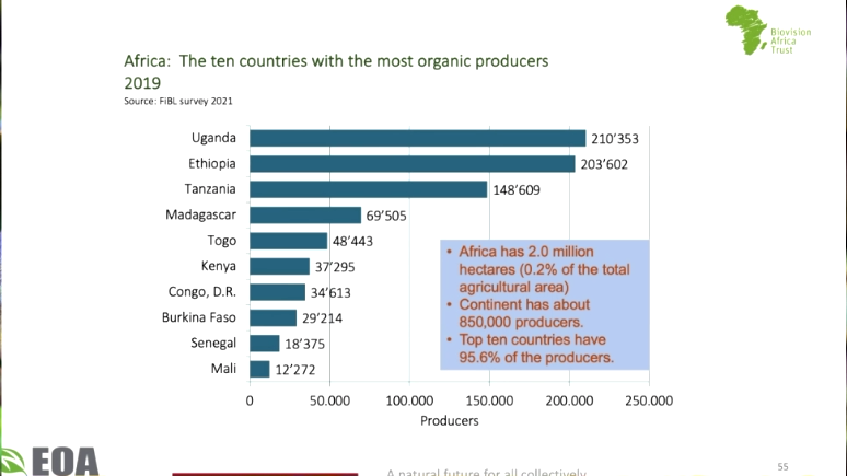 圖1. 截至2019年,非洲共有200萬(wàn)公頃的土地用于有機(jī)生產(chǎn),有機(jī)生產(chǎn)者數(shù)量超過(guò)85萬(wàn)人,突尼斯、坦桑尼亞和埃塞俄比亞是非洲有機(jī)種植面積最多的國(guó)家,非洲的有機(jī)產(chǎn)品主要出口歐盟。