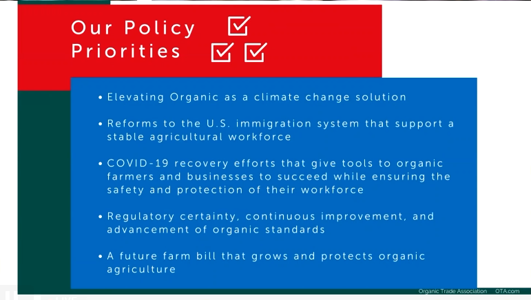 圖4. 美國(guó)的政策:推薦將有機(jī)農(nóng)業(yè)視為解決氣候變化的解決方案;建議修訂移民法案以保證農(nóng)業(yè)勞動(dòng)力穩(wěn)定充足;COVID-19 疫情影響下,有機(jī)產(chǎn)業(yè)生產(chǎn)者都取得了巨大的成功,保證了有機(jī)生產(chǎn)者的安全與勞動(dòng)力;對(duì)美國(guó)有機(jī)標(biāo)準(zhǔn)持續(xù)改進(jìn),保持領(lǐng)先;促進(jìn)未來(lái)農(nóng)業(yè)法案,保證和保護(hù)有機(jī)農(nóng)業(yè)發(fā)展。