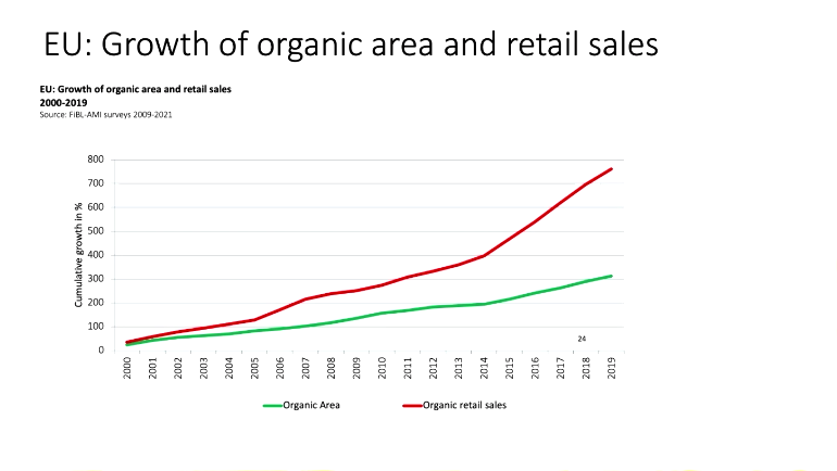 圖1. 歐盟有機(jī)種植面積和有機(jī)產(chǎn)品產(chǎn)值逐年增長(zhǎng)。