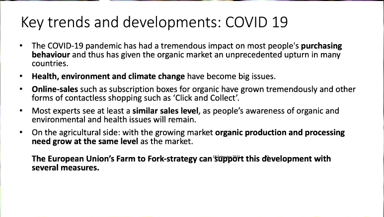 圖2. COVID-19疫情對(duì)人們的消費(fèi)行為產(chǎn)生了驚人的影響,這給世界上很多國(guó)家的有機(jī)市場(chǎng)帶來(lái)了空前的增長(zhǎng)和提升;健康、環(huán)境和氣候變化成為主要問(wèn)題;有機(jī)產(chǎn)品的在線(xiàn)銷(xiāo)售模式迎來(lái)巨大增長(zhǎng);人們更加了解到有機(jī)食品對(duì)健康和環(huán)境影響的正面影響;有機(jī)農(nóng)業(yè)發(fā)展如有機(jī)市場(chǎng)般增長(zhǎng)巨大。