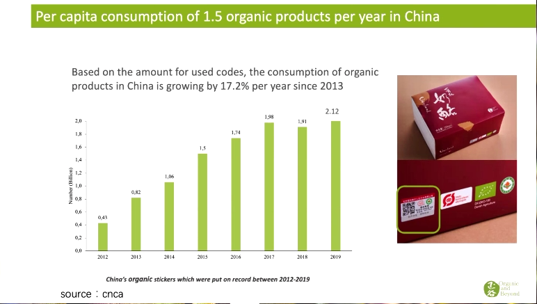 圖. 根據(jù)有機(jī)碼使用數(shù)量統(tǒng)計(jì),2013年至2019年,中國(guó)有機(jī)產(chǎn)品的消費(fèi)市場(chǎng)平均每年保持17.2%的增長(zhǎng),其中2019年共使用21.2億枚有機(jī)碼。