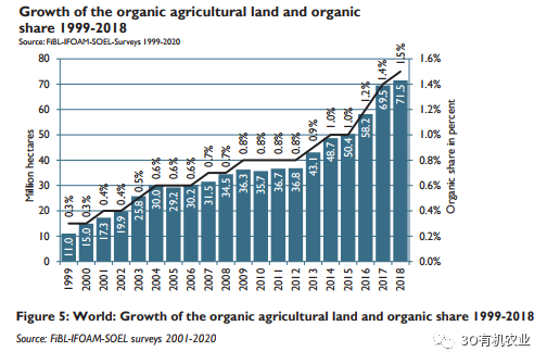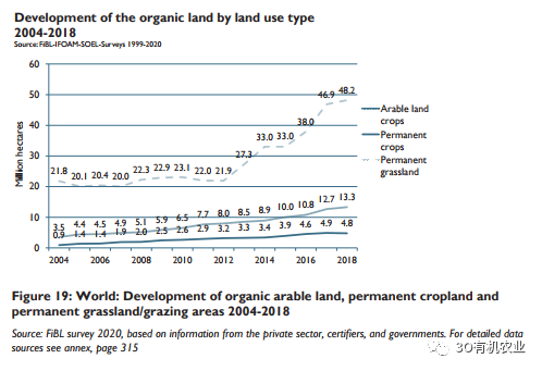 2018年,全球有機農地面積增加了200萬公頃,增長率為2.9%。