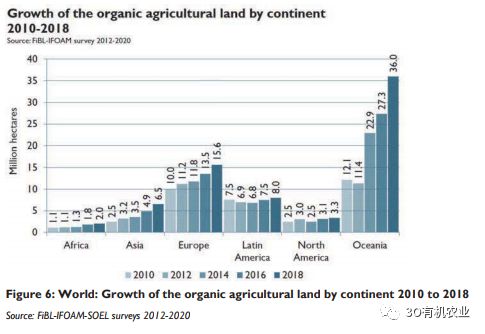 歐洲農地面積增長了近125萬公頃(增長8.7%);亞洲有機農地面積增加了54萬公頃,增長了將近8.9%;非洲有機農地面積增加超過4000公頃,增長了0.2%;拉丁美洲有機農地面積增加了13000公頃,增長了0.2%;北美洲有機農地面積增加了近10萬公頃,增長超過3.5%;大洋洲有機農地面積增加超過10萬公頃,增長了0.3%。