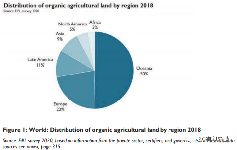 從地域上來看,在總農業用地中有機農地占比最高的兩個大洲分別是大洋洲(8.6%)和歐洲(3.1%,其中歐盟有機農地占比為7.7%)。