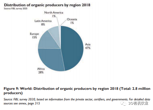 其中,47%的有機生產者分布亞洲,其次是非洲(28%)、歐洲(15%)和拉丁美洲(8%)。