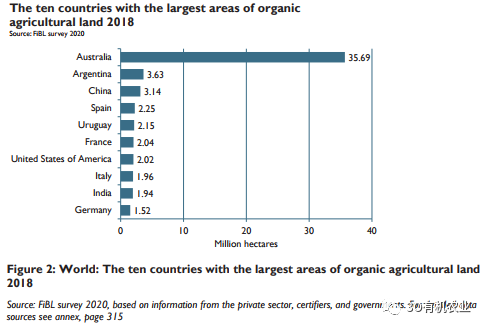 有機農地面積最大的三個國家分別是澳大利亞(3570萬公頃)、阿根廷(360萬公頃)和中國(310萬公頃)。(譯注:2015年中國的有機農地面積為161萬公頃,世界排名第五位)。