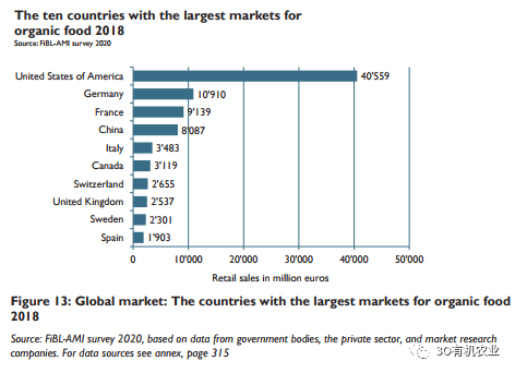 在2018年,最大的有機產品市場是美國(406 億歐元)、德國(109億歐元)和法國(91億歐元)。