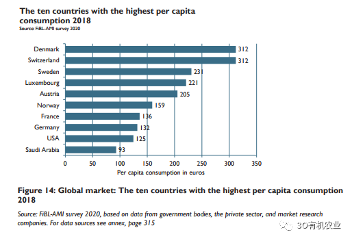 2018年全球有機食品人均消費最高的國家是瑞士和丹麥,為312歐元。有機市場份額占比最高的國家是丹麥(11.5%)、瑞士(9.9%)和瑞典(9.6%),丹麥也是第一個有機市場份額超過10%的國家。