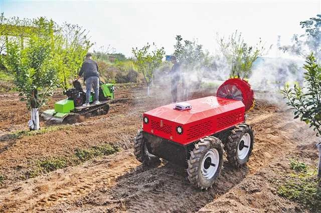 順著眾人視線望去,只見在一塊果園里,一臺“背著”風扇的大紅色農機十分“炫酷”。果園的另一邊,市農科院農機所高級工程師佘小明利用遙控器遠程操作,車子在果園里如履平地,尾部同時釋放出水霧對果樹進行噴灑。