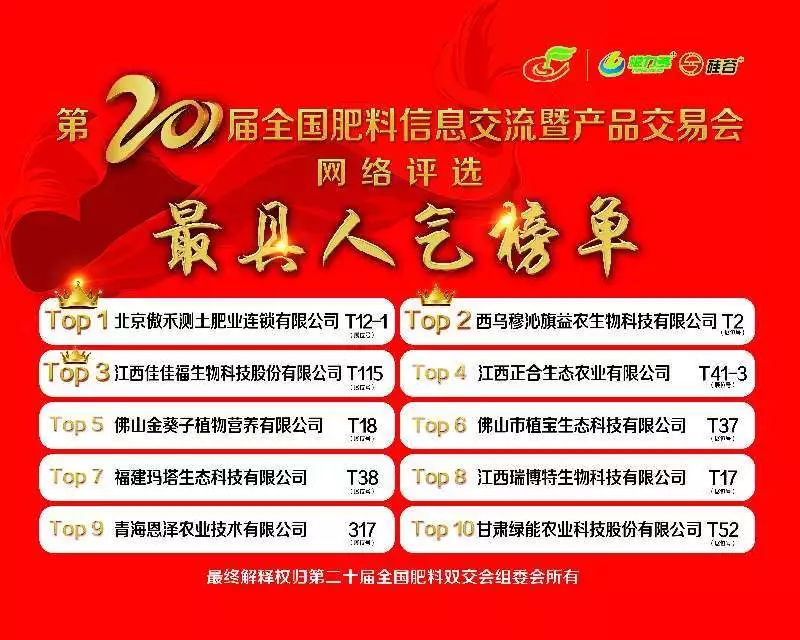 經過緊張的投票評選和嚴格的審查復核,第二十屆全國肥料雙交會參展商“最具人氣企業”評選網絡投票結果新鮮出爐!!!此次投票從2018年10月8日8時開始,到2018年10月13日17時結束。截止13日17時,共有4455145人次訪..