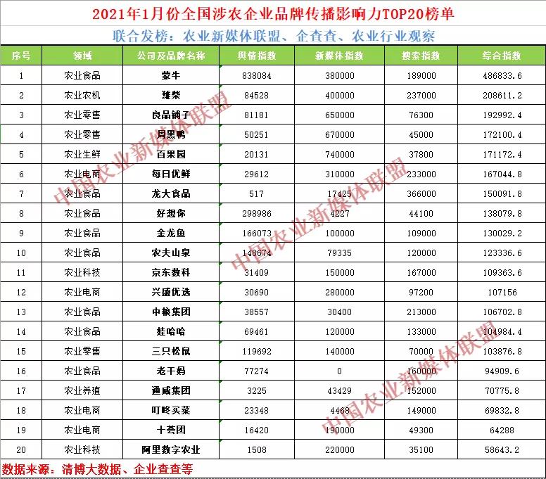 近日,由農業(yè)新媒體聯(lián)盟、企查查、農業(yè)行業(yè)觀察聯(lián)合發(fā)布的2021年1月份全國涉農企業(yè)品牌傳播影響力TOP20榜單..